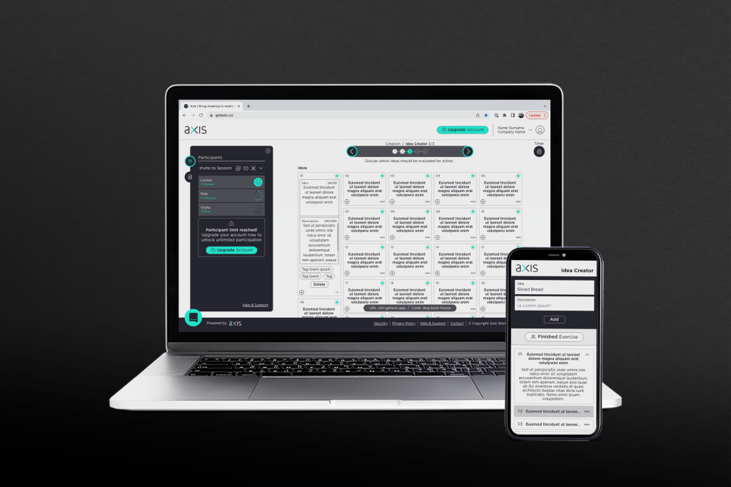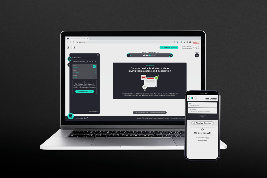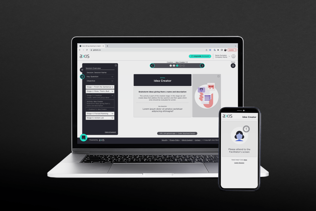 The live screens of the Axis product are the most critical part of the user experience, as these make up the digital collaboration experience for both user groups (Host & Participants). When redesigning these screens, we wanted users to be able to easily navigate through, comprehend and enhance their live workshop experience via use of Axis features in a digital space. By allowing the user to do so easily, this builds upon the already-proven basic product offering of ideation, evaluation and action in workshopped problem solving.