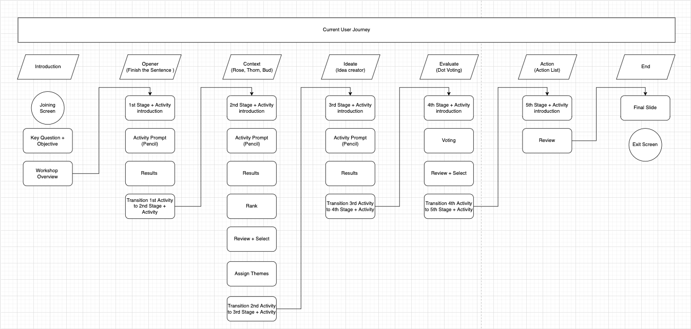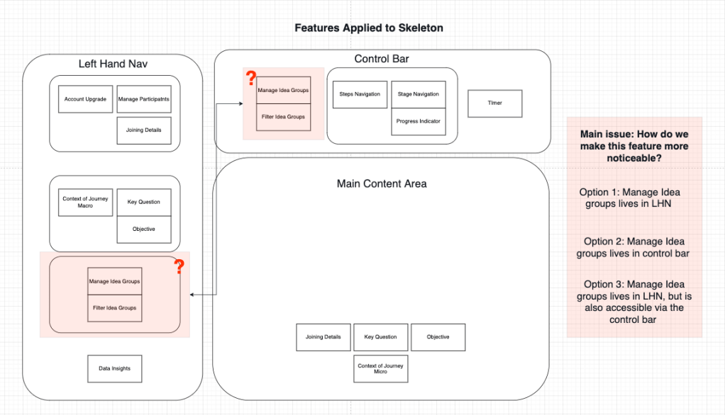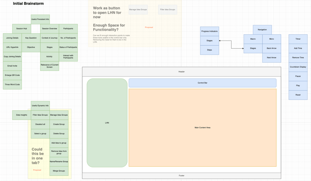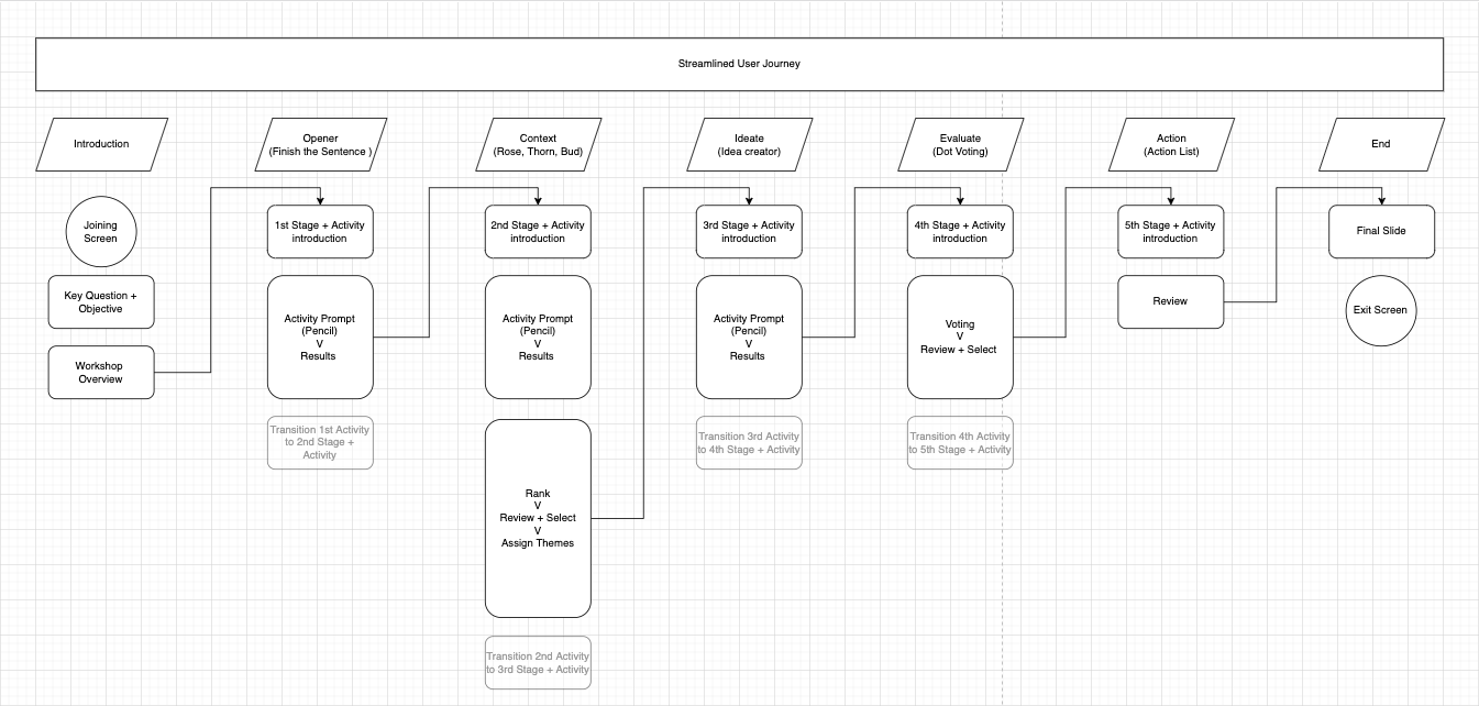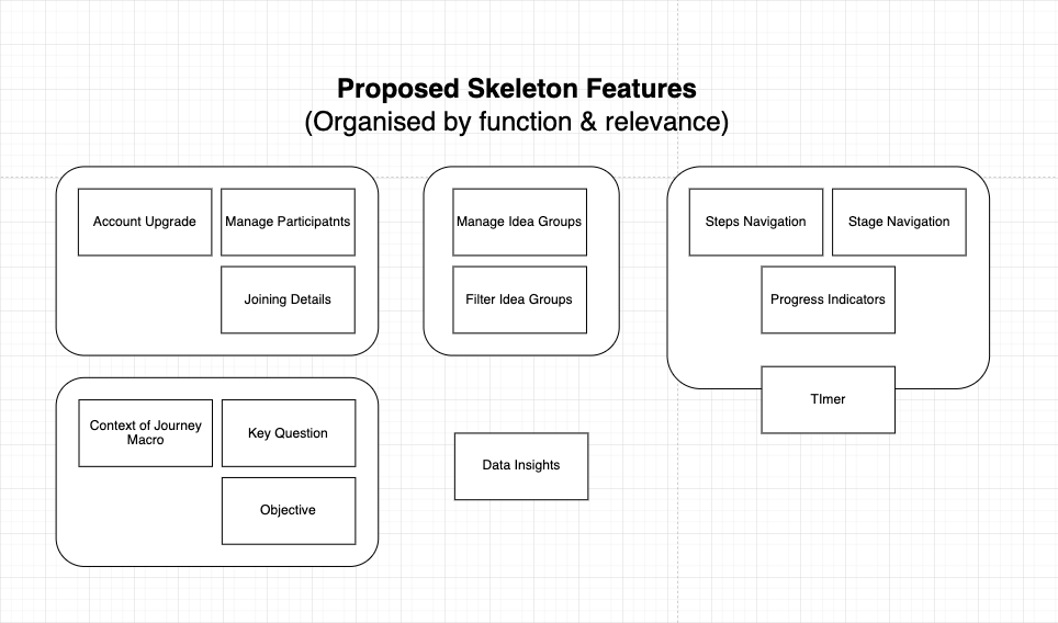 The user journey was refined through elimination of unnecessary steps in combination with inserting journey appropriate break steps with clearer signposting. This made the user journey much more organic, structured and constructive. Skeleton features were reorganised and grouped according to function as well as with respect to their relevance to the current part of the user journey within the workshop. This, alongside UI additions to bring further attention to key features, ensured the user had convenient access to all features that would enhance their workshop experience.